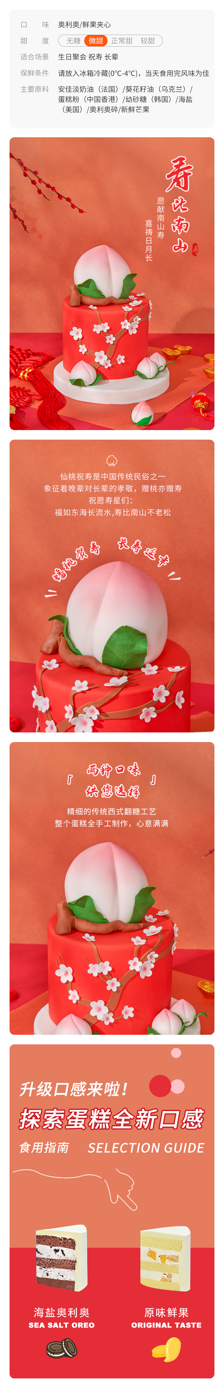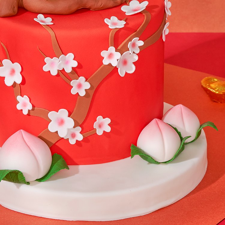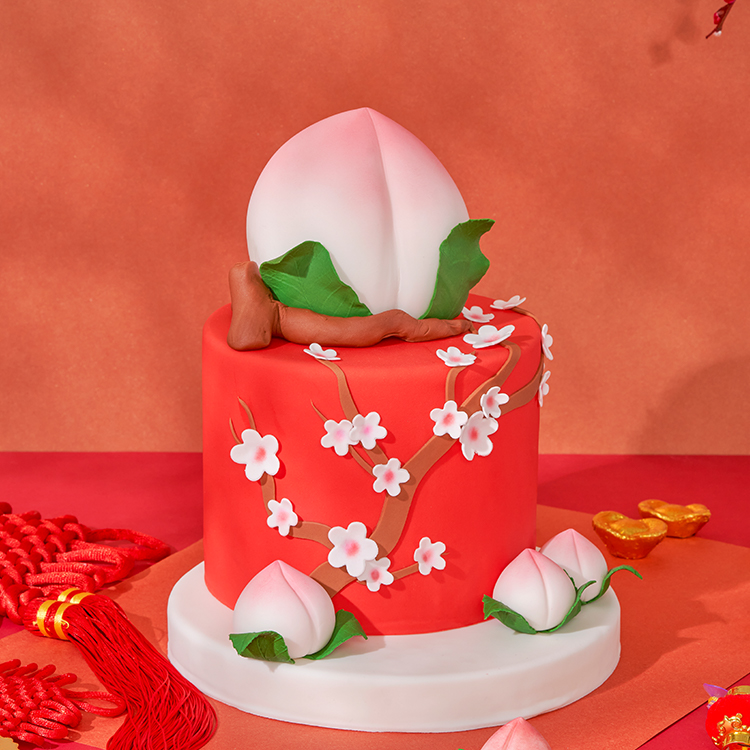 蟠桃贺寿是中国传统民俗之一,象征着晚辈对长辈的孝敬。“仙桃祝寿”寓意益寿延年,搭配红火又喜庆的纯手工翻糖蛋糕表面,喜庆又吉祥。当季鲜果夹心&海盐奥利奥双重口味供你选择,心意满满。愿献南山寿,喜祷日月长。