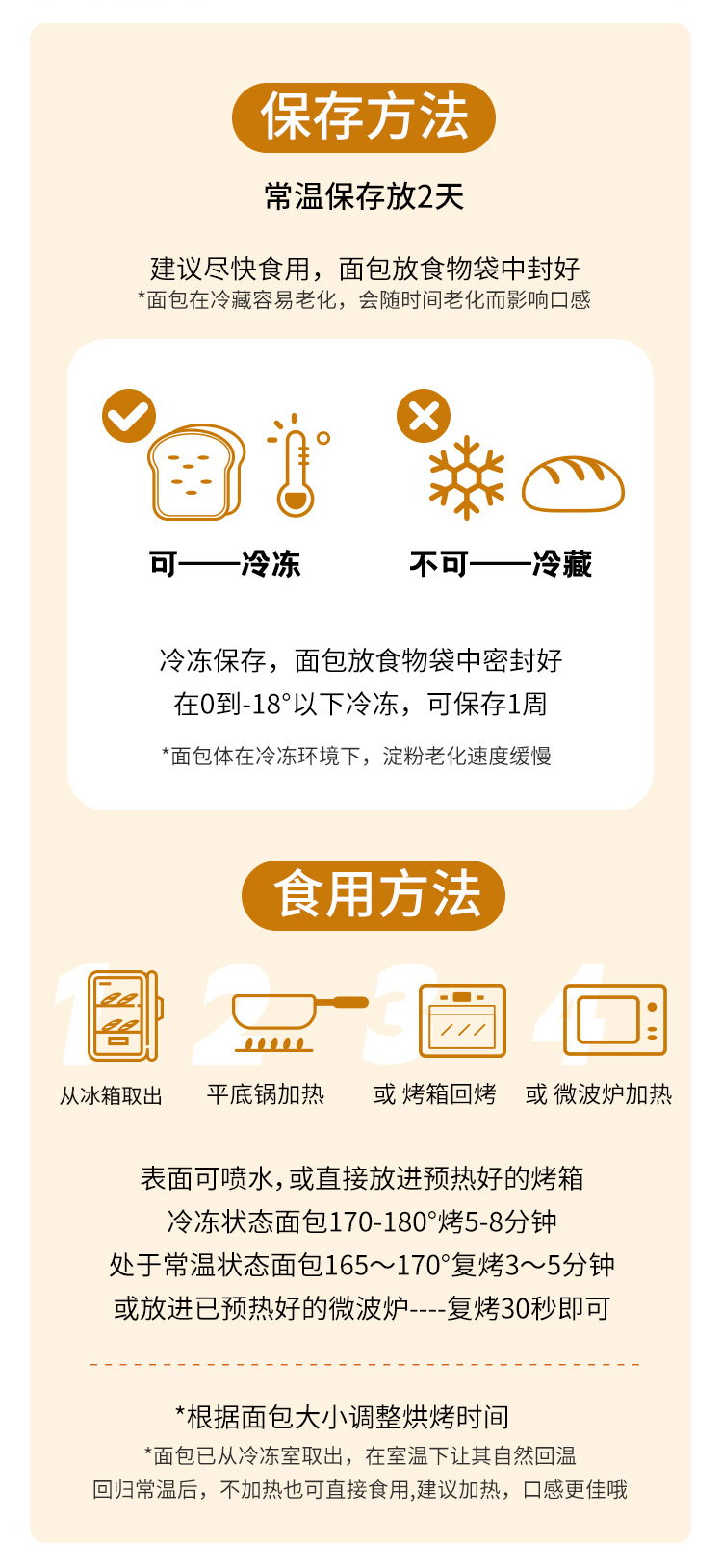 常温保存阴凉干燥处,如果您希望保存更长时间,收到货后可用保鲜膜或密封袋装立即封口,独立包装好,放入-18°c冷冻冰箱储存,这样能储存1周的时间,需要食用时,取出常温下解冻,烤箱复热或者平底锅复热再食用。不可反复解冻哦~